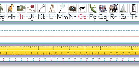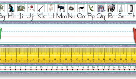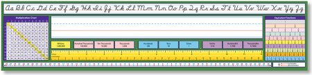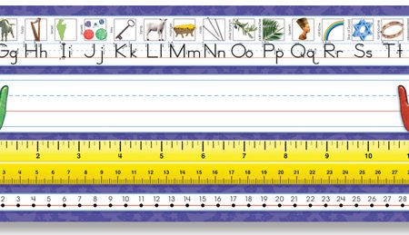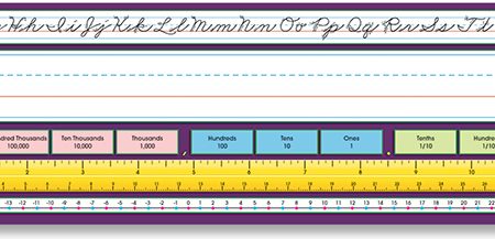 This Intermediate desk plate includes Contemporary Cursive alphabet line, name plate, place value, 12″ (30 cm) ruler, number line (-30 to 30), 12×12 multiplication chart, and equivalent fractions.