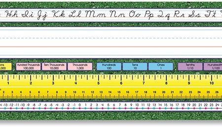 This Primary desk plate includes Modern Manuscript photo alphabet line, name plate with left and right handprints, 12″ (30 cm) ruler, number line (0 to 30), shapes and colors, U.S. currency and counting 1-120 chart.