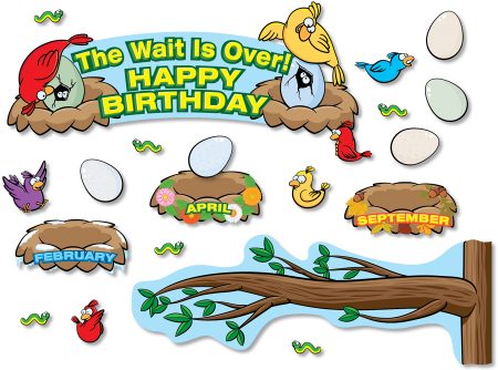 Celebrate your flock with this fun set of humorous birds and their hatching brood of birthday chicks! Personalize the multi-colored eggs with students’ names and birthdays, and display them all year in labeled nests with seasonal accents. Rotate the nests on the colorful tree limb to highlight the current birthdays. Includes 35 blank eggs, a 32-1/2″ x 12-1/2″ (83.2x 31.8 cm) banner a 33-1/2″ x 12″ (85.1 x 30.5 cm) limb, twelve nests, and 26 accent pieces. Includes a four-page teacher guide with reproducibles. 75 pieces.