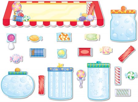 Features a 29 1/4” x 7 1/2” (74.3 x 19.1 cm) awning for use as a sign, 5 candy jars, 56 candy pieces, and a four-page teacher guide with reproducibles. 63 pieces. Not all pieces shown.