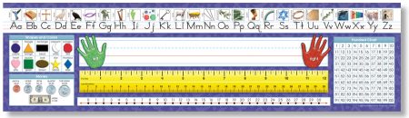 Primary desk plates include photo alphabet line featuring Biblical images and symbols, name plate with left and right handprints, 12″ (30 cm) ruler, number line (0 to 30), shapes and colors, U.S. currency, and hundred chart. 36 per package.