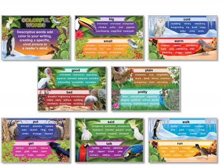 Expand students’ understanding of the importance of vivid, specific word choices to make their writing more descriptive, interesting and accurate. An 11″ x 17″ (27.9 x 43.2 cm) introductory poster familiarizes students with the difference between non-descript (pale) words and descriptive (colorful) words. Seven additional 11″ x 17″ (27.9 x 43.2 cm) posters, with engaging bird photographs and bright colors to capture students’ attention, offer examples of pale words and colorful alternatives. Includes a two-page teacher guide. 8 pieces.