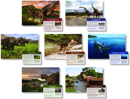 Five 24” x 34-1/2” posters featuring Tyrannosaurus Rex, Brachiosaurus, Triceratops, Archelon & Tylosaurus, and Velociraptor. Two 18” x 26” posters featuring Stegosaurus and Pachycephalosaurus. Seven two-sided 4” x 6” informational cards with details about the featured dinosaurs and a description of the corresponding scene depicted on each poster.