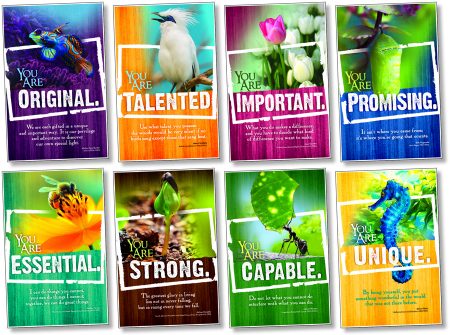 Affirm and encourage students with these simple messages and uncomplicated images, combined with uplifting quotations from well-known educators, community leaders, and public figures. Eight 11″ x 17″ (27.9 x 43.2 cm) posters communicate the intrinsic value of every individual and remind us of each person?s ability to make a contribution and improve society. 8 pieces.
