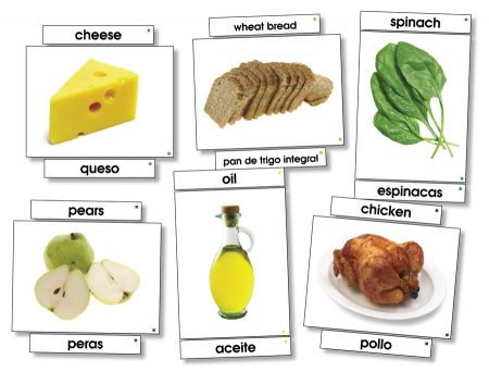 Numbered, color-coded food cards help students recognize the proper nutritional category of familiar foods. Twenty-eight two-sided 6″ x 8″ (15.2 x 20.3 cm) cards feature full-color photos of foods in six nutritional groups: grains, fruit, vegetables, meat & beans, dairy, and oils. The set includes matching numbered word cards with the name of the food in English on one side and in Spanish on the reverse. Not all pieces shown.