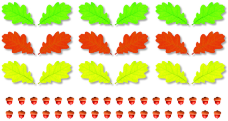 Features pre-cut autumn leaves, 16 each in 3 fall colors – bronze, yellow and light green. Left and right orientation for use in back-to-back applications. Package also includes 48 bonus printed acorns for user cut-out. Total 48 pre-cut pieces. Minimum order 2 packages.