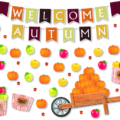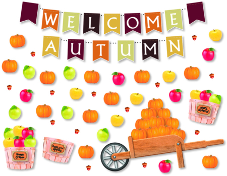 Use harvest time to illustrate counting, sorting, grouping, and simple math story problems. Photo-realistic set features a 31¼” x 8¾” (79.4 x 22.2 cm) cart, 36 pumpkins, 45 apples, 3 baskets, 4 signs, and a 16-piece banner. Also includes 13 bonus printed acorns (1½” wide, not precut). 105 pieces.