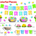 NEW! Brighten up your classroom and use the spring-themed pieces to illustrate counting, sorting, grouping, and math story problems. Set features 63 eggs, 3 baskets, 3 blank tags, 6 colorful pails, 6 flower bunches, and a 16-piece banner. 97 pieces. UPC#: 8 75188 00592 1 Purchase includes a bonus teacher guide as a free PDF download.