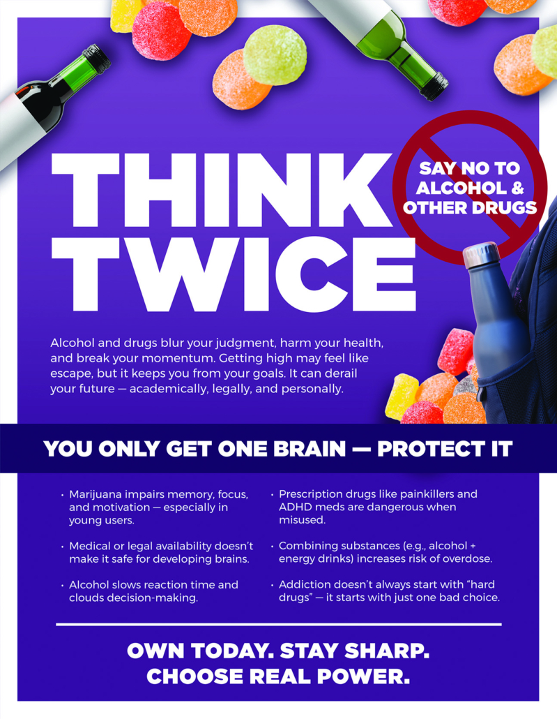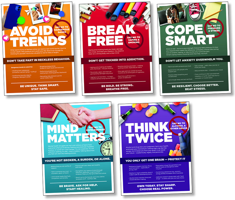 Each poster focuses on a key topic students encounter as they grow—vaping and smoking, alcohol and drug use, online trends and risky behaviors, stress management, and mental health support. Strong color themes, realistic imagery, and confident typography make the messages easy to read and understand from a distance, while the supportive tone helps students feel informed, empowered, and encouraged rather than judged.