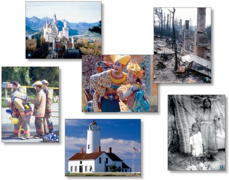 Photos in this set focus on friends, familiar activities, community helpers, people from far-off places, architecture, social issues, disasters, history, cultures, nature, and sports and recreation.