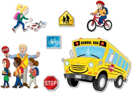 School bus measures 14 1/4” x 11 1/4” (36.2 x 28.6 cm). 7 pieces. For easy decorating, simply pop out these two-sided decorations and hang them on windows, walls, doors, or as mobiles!