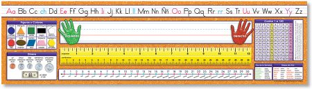 Spanish desk plates include alphabet line, name plate with left and right handprints, 12” (30 cm) ruler, number line (0 to 30), shapes and colors, money, counting 1-120 chart, days of the week, and months of the year. Size 19 x 5″ (48.3 X 12.7 cm) 36 per package. Note: although ch (che), ll (elle), and rr (erre) are not separate letters in the dictionary, as established in 1994 by the Royal Spanish Academy (RAE), they are shown because of the unique sounds they represent in the Spanish language.