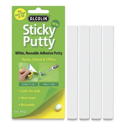 Alcolin Sticky Putty for school, home or office The Duct Tape of Tak® White reusable adhesive putty and smart mounting replacement for pins, tape and thumbtacks. It works great with posters! It is quick, easy way to stick up posters, maps, calendars and decorations. It never dries out or shrinks. Safe for Kids and Non-Toxic. Suitable for most porous and non-porouse surfaces. For lightweight applications only. It is solvent-free, non-toxic and safe for children to use. It will not shrink or dry out and can be removed and used over and over again.