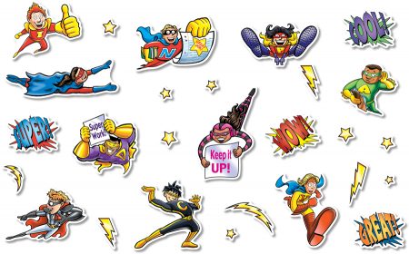 Best Seller! Use accents to liven up bulletin boards, desks, lockers, and cubbies! Can be used as name tags, labels, or to highlight student work. Size of individual diecut accent pieces varies. Set features 10 superheroes, 4 words, 6 lightning bolts, and 9 stars. Package measures approximately 6” x 8” and contains 116 diecut pieces in total.