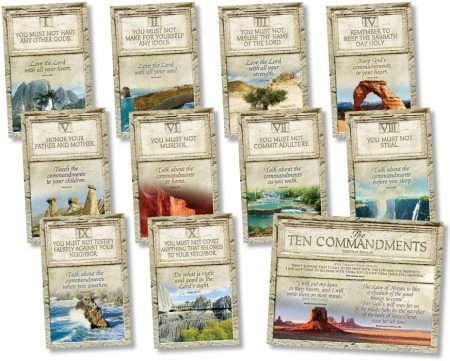 The Ten Commandments, though written in stone long ago, are timeless, relevant instructions for living in harmony with God and others. Using photography of enduring rock formations combined with natural, living elements, this set serves as a reminder that God’s abiding laws are to be written in our hearts.Ten 11″ x 17″ (27.9 x 43.2 cm) posters feature each of the commandments and a 17″ x 22″ (43.2 x 55.9 cm) title poster uses Bible verses to clarify the connection between the Commandments and the New Testament. 11 pieces