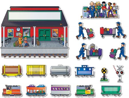 Out of Stock & Discontinued. We’re Sorry! Features a 20 1/4" x 15" (51.4 x 38.1 cm) train station, 32 train cars, 11 train station accents, and a four-page teacher guide with reproducibles. 44 pieces. Not all pieces shown.