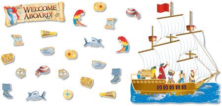 Out of Stock & Discontinued. We’re Sorry! Sail into a rollicking classroom adventure! Welcome students and visitors to the classroom, highlight student work, and add flair to displays with this colorful bulletin board set. Features a 21 1/4” x 7 1/4” (54 x 18.4 cm) banner, a 32 1/4” x 36 3/4” (81.9 x 93.3 cm) pirate ship, and three each of 11 themed accent pieces to accompany the ship or display independently around the room. Includes a four-page teacher guide with reproducibles. 37 pieces. Not all pieces shown.