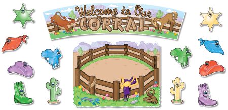 Round ’em up! Welcome students to school with this fun and colorful theme. Use this bulletin board to motivate students, assign jobs, or reinforce concepts. Features a 35 1/4” x 9 1/4” (89.5 x 23.5 cm) ”Welcome to Our Corral” banner and 5 of each accent piece (bandanna, boot, cactus, hat, saddle, and star). The 21 1/2” x 16 1/2” (54.6 x 41.9 cm) corral piece can be used to store accent pieces. Includes a four-page teacher guide with reproducibles. 33 pieces. Not all pieces shown.