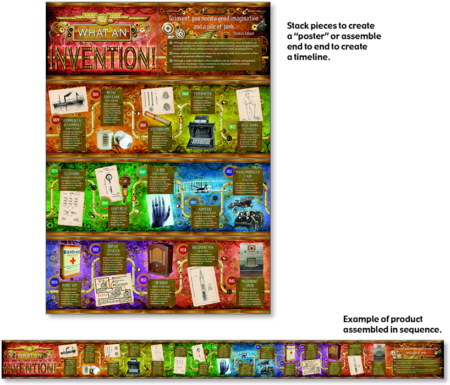 From life-saving medical devices to entertaining gadgets, every invention has a story. This behind-the-scenes exploration reveals the origin of familiar and specialized inventions, and introduces the imaginative people who created them. Assemble strips end-to-end at 88″ wide x 7.625″ high (19.4×223.5cm) or assemble in poster format at 22″ wide x 30.5″ high.