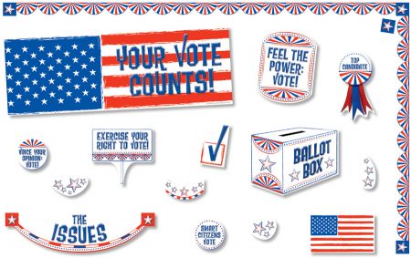 Highlight the value of a vote! Built around an election theme with patriotic colors and political images, this versatile set is ideal for classroom studies of national, state, local, or student elections. Features a 19½” x 6¾” (49.5 x 17.1 cm) banner, 19½’ (5.9 m) of trim, and die-cut pieces of political buttons, election-related phrases, yard signs, and more. 49 pieces.